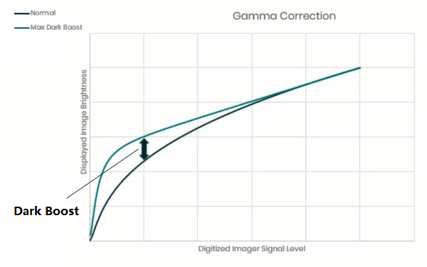 韋林孔探儀的暗部增強技術(shù)能夠評估場景的亮度內(nèi)容、并智能調(diào)整伽馬校正水平以進一步增加檢測圖像中黑暗區(qū)域的亮度,從而顯現(xiàn)更多黑暗中的細節(jié)。如下圖,左側(cè)部分對應相對黑暗區(qū)域,也就是 Dark Boost 發(fā)生顯著作用的區(qū)域,右側(cè)則對應明亮區(qū)域。Dark Boost 的優(yōu)勢在于,顯著改善黑暗區(qū)域的清晰度,而不會使原本明亮區(qū)域同步出現(xiàn)高光溢出的現(xiàn)象。