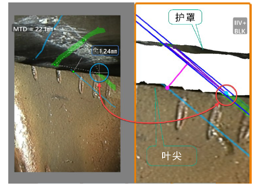 如下圖是采用傳統(tǒng)雙物鏡測量技術(也稱雙物鏡立體測量)的典型視圖。采用深度測量模式測量葉尖間隙時,選定三個點在在護罩上建立了一個數(shù)字參考平面。測量結果如圖所示,葉尖與護罩上所選數(shù)字參考平面之間的距離(間隙)為1.24mm。在傳統(tǒng)雙物鏡測量中,當將測量光標點放置于左側圖像上,系統(tǒng)自動匹配右側圖像上的相同像素點,這張圖即使是專業(yè)內窺鏡檢測技術人員也無法找出存在的問題。但請注意綠色箭頭所指示的點。